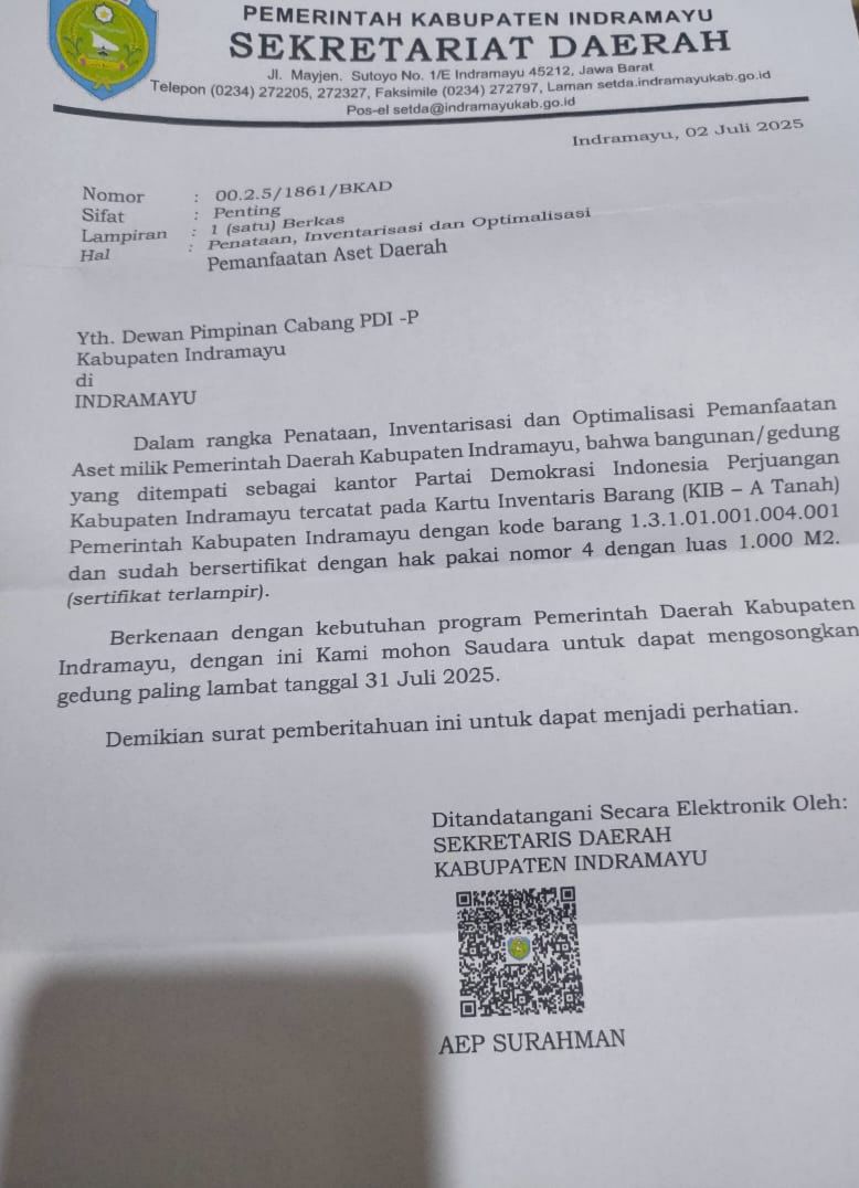 INDRAMAYU-JAYA NEWS.COM – Ketua Dewan Pimpinan Cabang (DPC) PDI Perjuangan Kabupaten Indramayu, H. Sirojudin, memberikan tanggapan atas surat yang diterbitkan oleh Sekretaris Daerah Kabupaten Indramayu terkait pengosongan aset daerah yang selama ini dipergunakan sebagai kantor DPC PDI Perjuangan.
