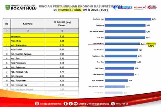 Angka tersebut tertuang dalam rincian Pertumbuhan Ekonomi Kabupaten/Kota se-Provinsi Riau Triwulan II (Year on Year), di mana capaian Rokan Hulu melampaui rata-rata provinsi yang berada di angka 4,59 persen dan juga di atas rata-rata nasional sebesar 5,13 persen.