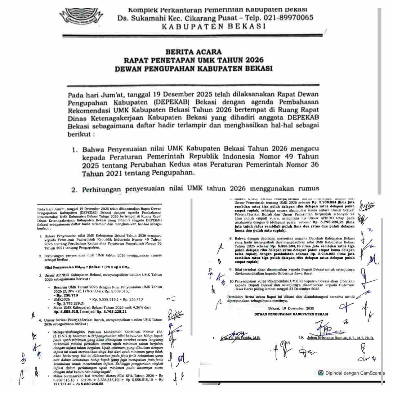 Dengan formulasi tersebut, UMK Kabupaten Bekasi Tahun 2026 resmi disepakati naik sebesar 6,84 persen, dari sebelumnya Rp5.558.515,10 menjadi Rp5.938.884,18 atau dibulatkan menjadi Rp5.938.885.