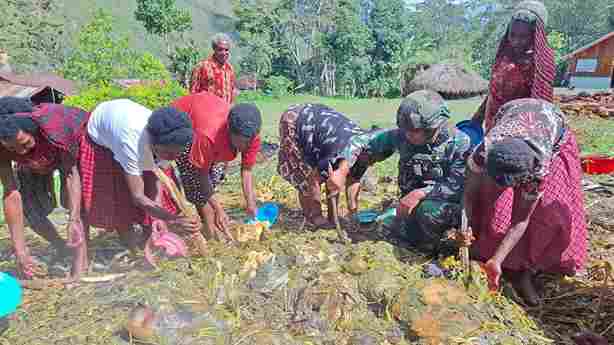 Binter TNI Dalam Ritual Bakar Batu Satgas Yonif 521/DY Membangun Komunikasi Sosial dengan Masyarakat Papua