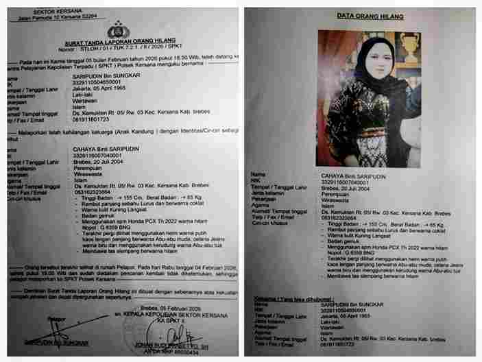 “Cahaya, yang diketahui lahir di Brebes pada tanggal 20 Juli 2004, memiliki tinggi badan sekitar 155 cm dan berat badan sekitar 65 kg. Ia memiliki ciri-ciri rambut panjang sebahu lurus dan berwarna coklat, kulit kuning langsat, dan badan gemuk,” ujar Sarifudin, Minggu 8 Februari 2026.