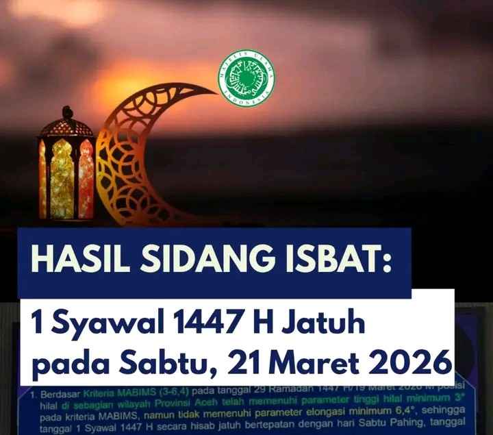 Resmi! Kemenag menetapkan 1 Syawal 1447 H jatuh pada Sabtu, 21 Maret 2026.
