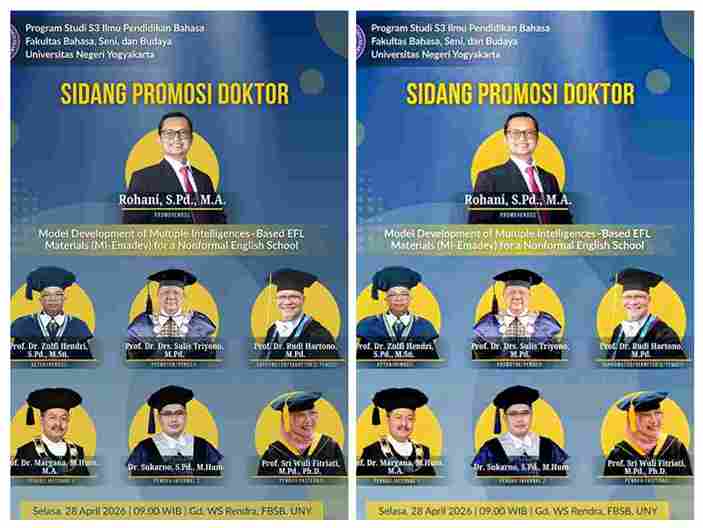 Yogyakarta-JAYANEWS.COM – Program Studi S3 Ilmu Pendidikan Bahasa, Fakultas Bahasa, Seni, dan Budaya (FBSB) Universitas Negeri Yogyakarta (UNY) menggelar Sidang Promosi Doktor atas nama Rohani, S.Pd., M.A. pada Selasa, 28 April 2026. Sidang terbuka dilaksanakan pukul 09.00 WIB di Gedung WS Rendra, FBSB UNY.